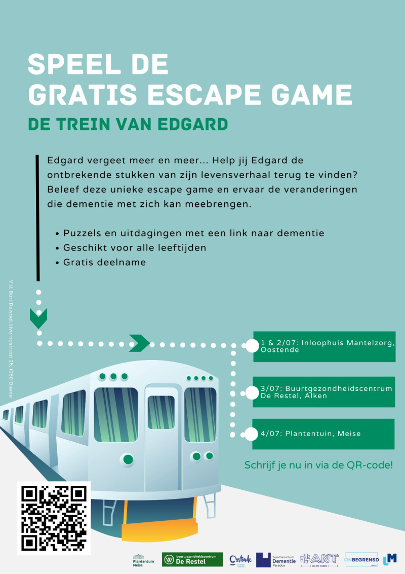 De Liberale Mutualiteit organiseert, in samenwerking met haar partner Onbegrensd vzw de escape game ‘De trein van Edgard’. Gedurende 40 minuten duik je in het levensverhaal van Edgard, waarin je niet alleen puzzels oplost, maar ook op een verrassende manier meer leert over dementie. In het spel zitten hints en subtiele verwijzingen naar dit belangrijke thema. Wil je na afloop graag even stilstaan bij wat je onderweg allemaal bent tegengekomen? Dan kan dat! Er is een optionele nabespreking van 20 minuten waarin we dieper ingaan op de link met dementie. Het spel is geschikt voor alle leeftijden en groepen van 2 tot 8 deelnemers.