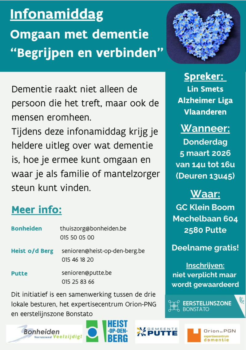 Infonamiddag in samenwerking met Eerstelijnszone Bonstato en de 3 lokale besturen (Putte- Heist op den Berg- Bonheiden) : “Omgaan met dementie – begrijpen en verbinden”