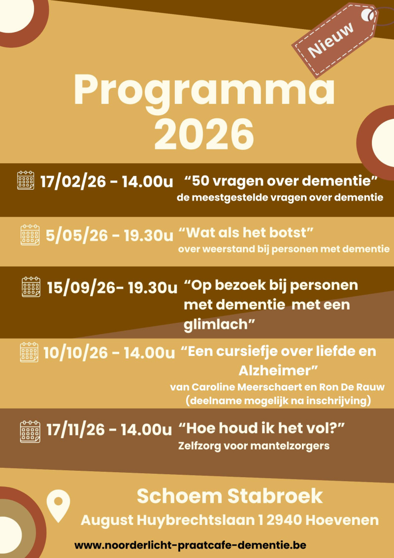 Het praatcafé Noorderlicht is een bijeenkomst voor familieleden en mantelzorgers van personen met dementie. Het sociale isolement dat de ziekte dementie meebrengt, proberen we te doorbreken op een informele en ontspannen manier. Je kan hier lotgenoten ontmoeten. Gevoelens van moeheid en onmacht kunnen bespreekbaar worden. Gedeelde zorg kan misschien halve zorg zijn.