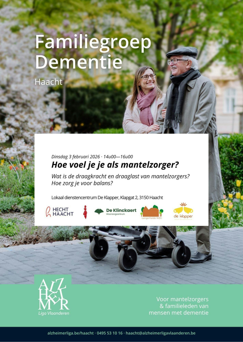 Bijeenkomst voor mantelzorgers en familieleden van mensen met dementie om samen hun hart te luchten en zorgen te delen met lotgenoten. Informatie en steun uitwisselen.