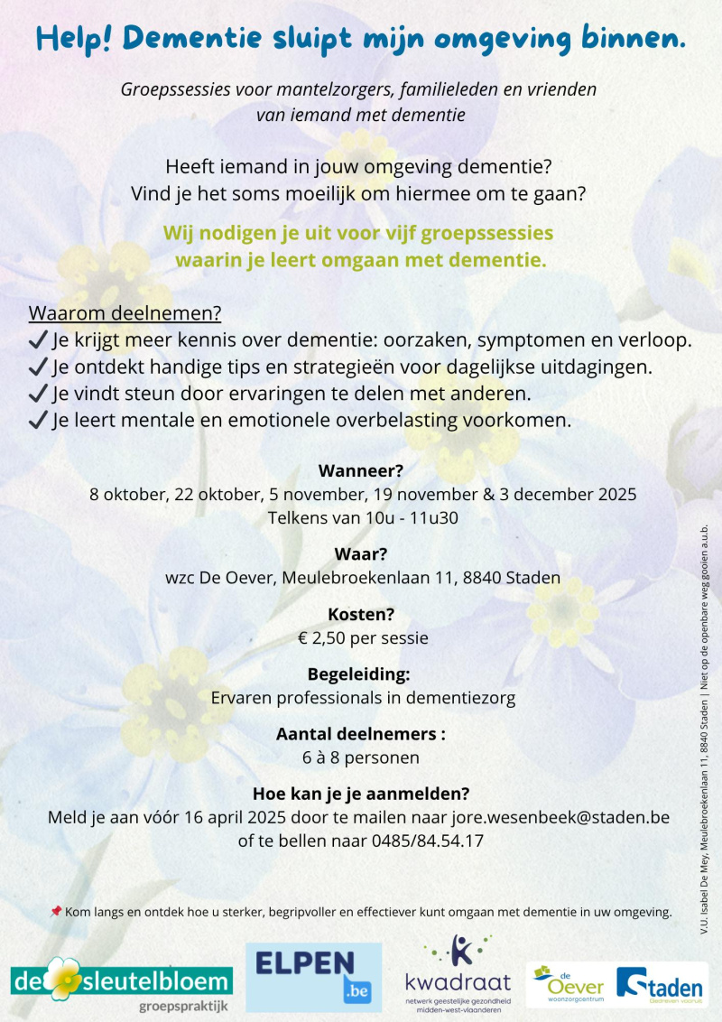 Bent u een familielid, vriend, kennis of mantelzorger van iemand met dementie? Voelt u zich soms overweldigd of onzeker over hoe u het beste kunt omgaan met deze situatie? Wij nodigen u van harte uit voor onze reeks van vijf groepssessies rond psycho-educatie over dementie, getiteld “Help! Dementie sluipt mijn omgeving binnen”.