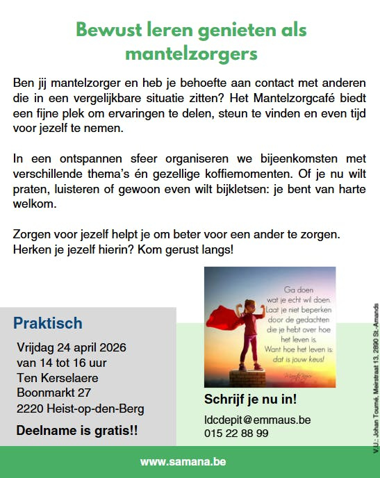 Ben jij mantelzorger en heb je behoefte aan contact met anderen die in een vergelijkbare situatie zitten? Het Mantelzorgcafé biedt een fijne plek om ervaringen te delen, steun te vinden en even tijd voor jezelf te nemen.
