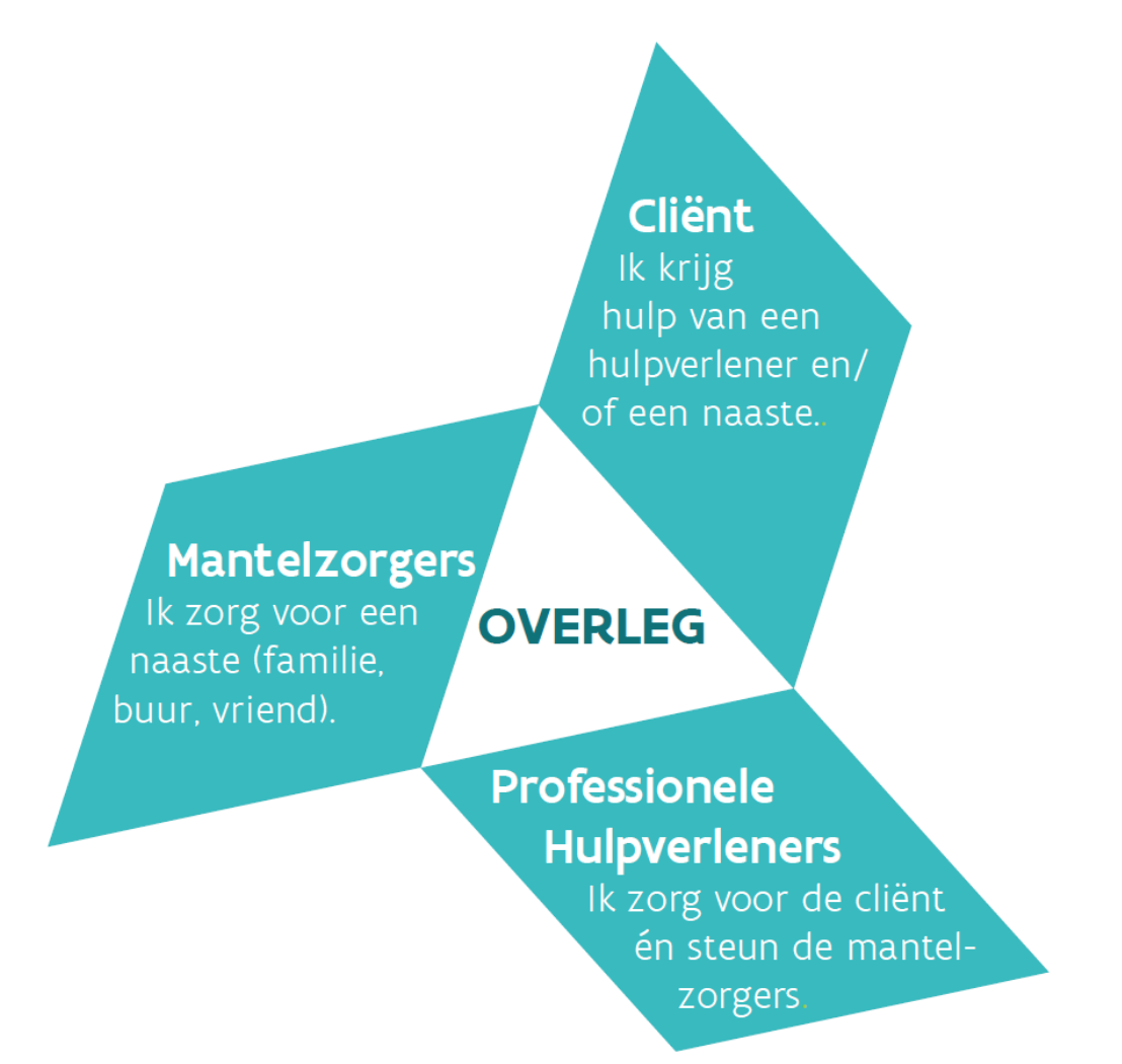 Als professionele hulpverlener heb je dus niet alleen een relatie met de patiënt of zorgvrager, maar ook met de mantelzorger. We spreken van een zorgdriehoek. Het is geen dialoog, maar een trialoog tussen zorgvrager-mantelzorger-zorgverleners.